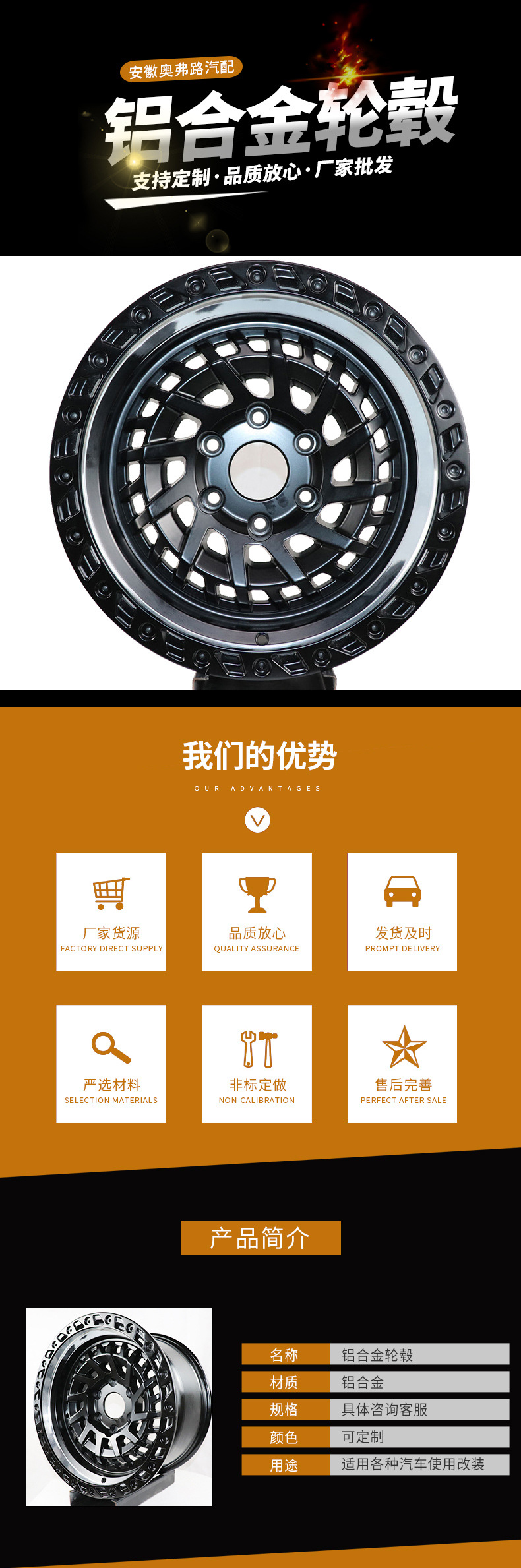 本网页所展示的有关【17寸越野改装轮毂旋压铸造轻量化高强度改装车轮汽车铝轮_轮毂_安徽奥弗路汽配有限公司】的信息/图片/参数等由车云汇的会员【安徽奥弗路汽配有限公司】提供,由车云汇会员【安徽奥弗路汽配有限公司】自行对信息/图片/参数等的真实性、准确性和合法性负责,本平台(本网站)仅提供展示服务,请谨慎交易,因交易而产生的法律关系及法律纠纷由您自行协商解决,本平台(本网站)对此不承担任何责任。您在本网页可以浏览【17寸越野改装轮毂旋压铸造轻量化高强度改装车轮汽车铝轮_轮毂_安徽奥弗路汽配有限公司】有关的信息/图片/价格等及提供【17寸越野改装轮毂旋压铸造轻量化高强度改装车轮汽车铝轮_轮毂_安徽奥弗路汽配有限公司】的商家公司简介、联系方式等信息。