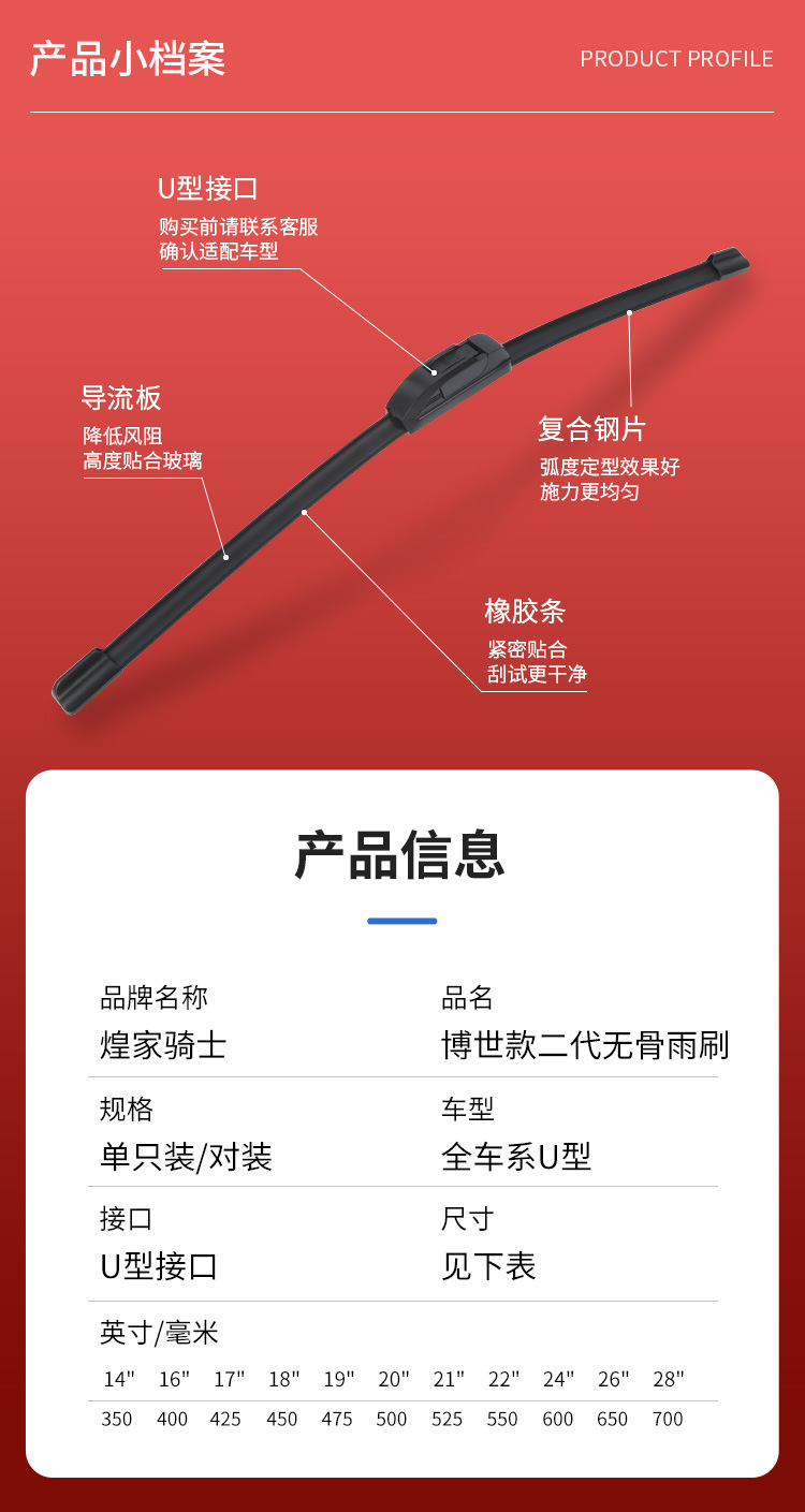 本网页所展示的有关【厂家供应博世款二代雨刮器适用U型接口高清静音耐用通用无骨雨刷_雨刮片_温州市煌家汽车配件有限公司】的信息/图片/参数等由车云汇的会员【温州市煌家汽车配件有限公司】提供,由车云汇会员【温州市煌家汽车配件有限公司】自行对信息/图片/参数等的真实性、准确性和合法性负责,本平台(本网站)仅提供展示服务,请谨慎交易,因交易而产生的法律关系及法律纠纷由您自行协商解决,本平台(本网站)对此不承担任何责任。您在本网页可以浏览【厂家供应博世款二代雨刮器适用U型接口高清静音耐用通用无骨雨刷_雨刮片_温州市煌家汽车配件有限公司】有关的信息/图片/价格等及提供【厂家供应博世款二代雨刮器适用U型接口高清静音耐用通用无骨雨刷_雨刮片_温州市煌家汽车配件有限公司】的商家公司简介、联系方式等信息。